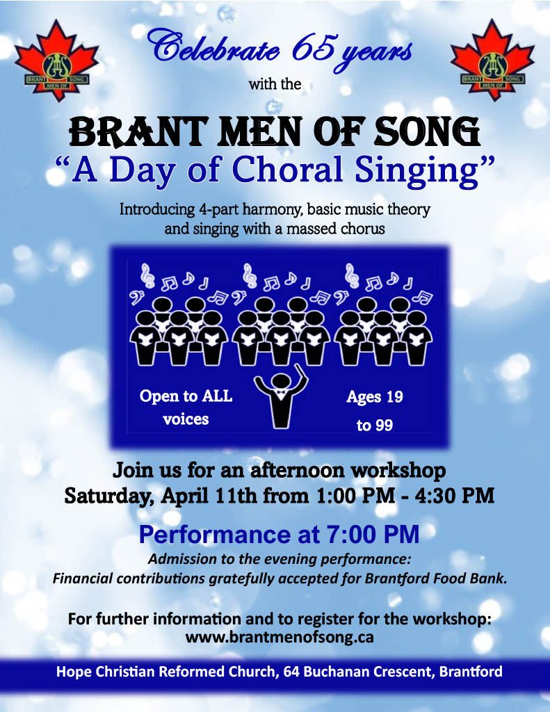 Welcome to the Brant Men of SongNext ShowApril 11, 2026 "A Day of Choral Singing" Join us for the workshop 1:00-4:30 PM, and then enjoy the free concert at 7:00 PM. RSVP to attend the workshop by filling in this form. All details are available on the Events page. Latest UpdatesBMOS has been featured in the news lately: In Other News...The men are looking to expand their numbers! Contact us for details on joining BMOS by email at: brantmenofsong@gmail.com. Any ladies interested in joining the Brant County Singers? Contact them by email at: brantcountysingers@gmail.com. Come visit us on Facebook! The Brant Men of Song are very fortunate to be supported by the City of Brantford and the County of Brant through their Community Grant Programs. |
